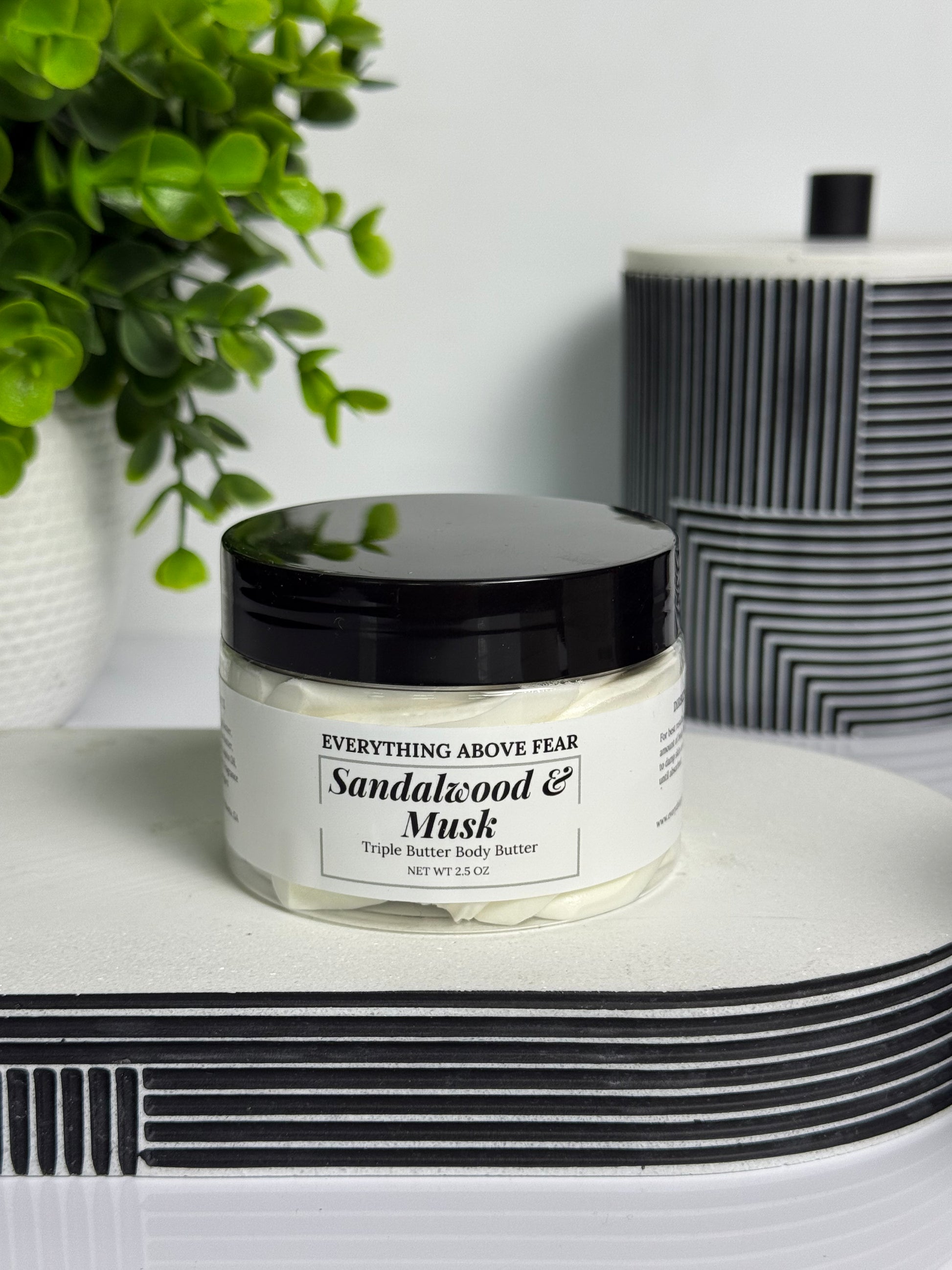 Ingredients: Shea Butter, Mango Butter, Coconut Oil, Cocoa Butter, Sweet Almond Oil, Jojoba Oil, Arrowroot Powder, Fragrance Oil, Vitamin E, Geogard
